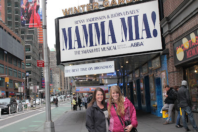 March 25: Morgan, Stephanie and I got on our 830am bus to New York City. I feel like this part of our trip could be a post in itself, so I will try to make this short and sweet. When we arrived in the City, we walked around the Garment District, obviously had to get a street hot dog, walked around Times Square and Broadway, went to m&m world and the Disney store, and ran into the famous Naked Cowboy. After checking into the hotel, we decided we wanted to try and get tickets to a Broadway show and voted on Mamma Mia. The day of tickets were $79, regularly almost $200, so we thought that was a great deal. The ticket booth guy offered us $50 seats with a $20 off student discount on top of that. Yes, we each paid $30 to see Mamma Mia on Broadway.... not a big deal ;). It was everything I expected and more (if you know me well, you know that Mamma Mia is my favorite movie and I have ALWAYS wanted to see the show). We went to dinner before the show, and went out after. This was my favorite day of their visit by far!